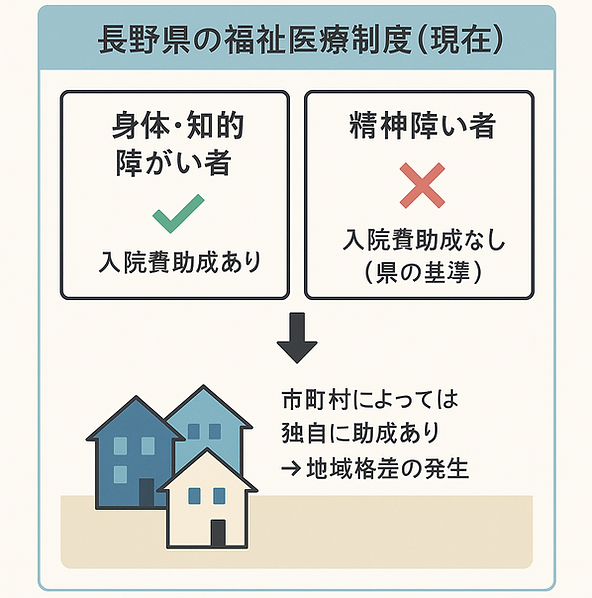 身体・知的障がい者には入院費助成があるのに対し、精神障がい者には入院費助成が無いなど、医療格差が生じています。